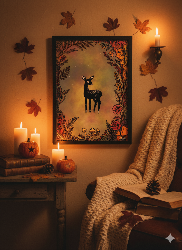 Plonge dans la douceur d’un soir d’automne avec cette illustration poétique où une biche veille au cœur de la forêt.